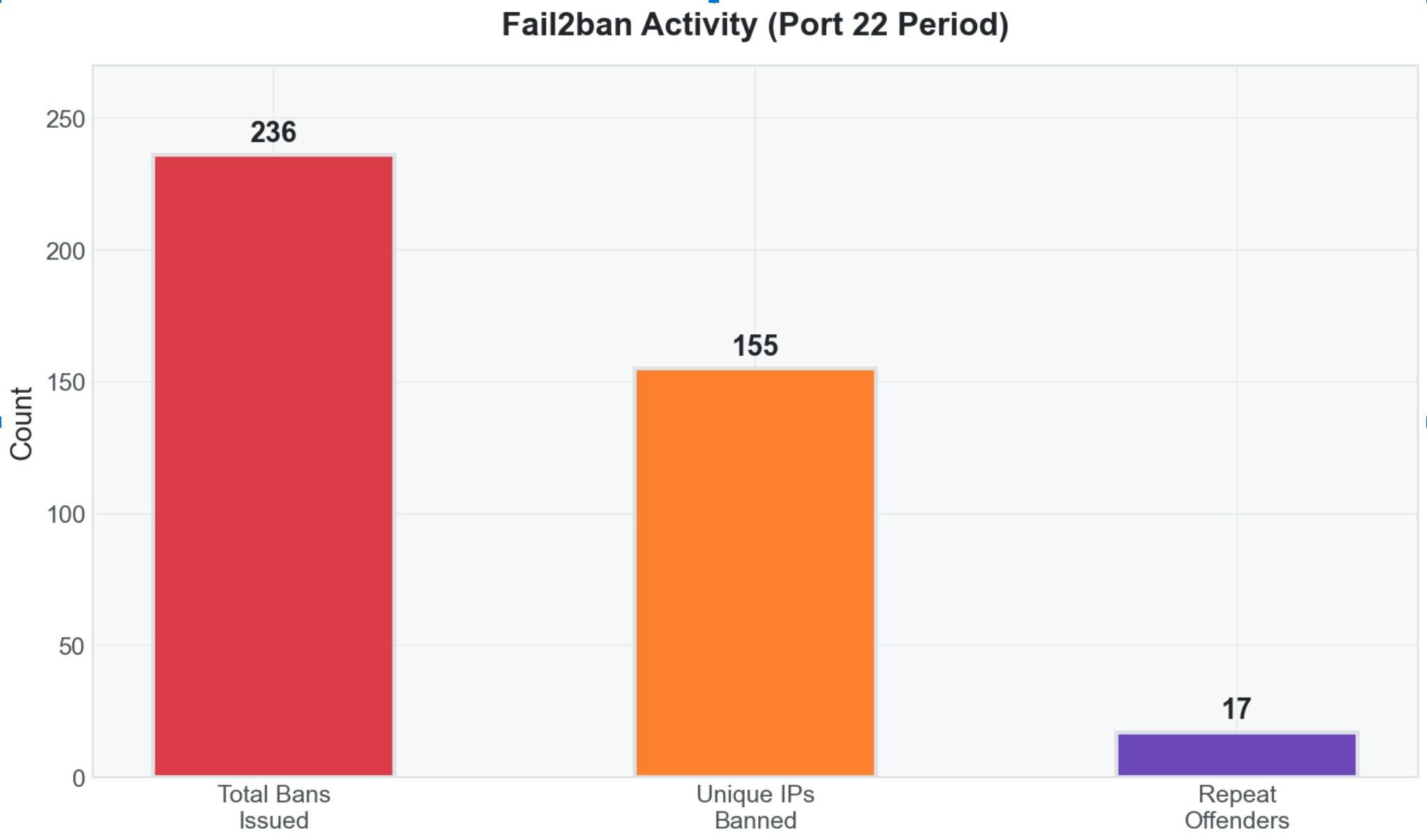 Uglavnom, unutar tridesetak sati koliko je SSHD bio konfiguriran da sluša na standardnom portu, 234 puta je IP adresa dodana na BAN listu, od čega je 154 adresa bilo jedinstveno.