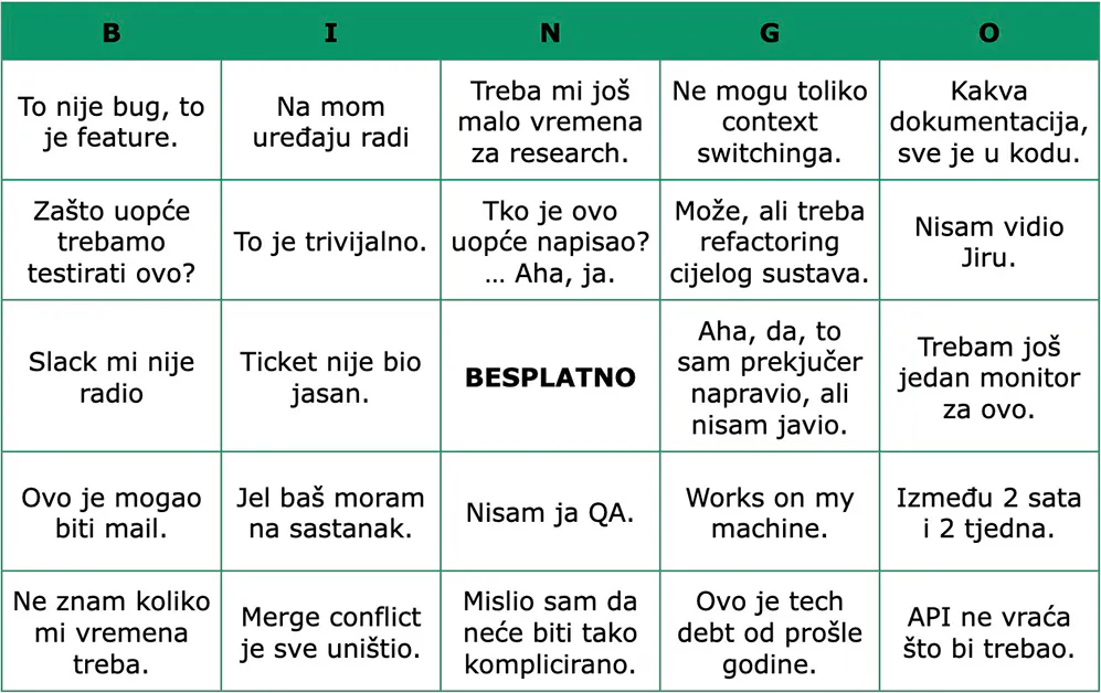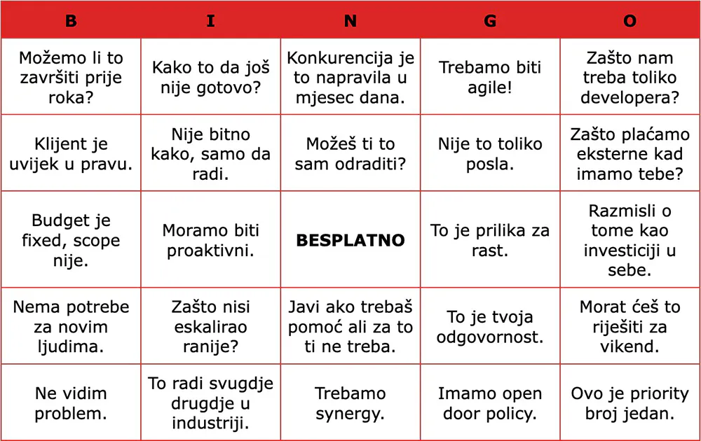 Osim očitog terapeutskog učinka, bingo kartice imaju i praktičnu primjenu. Nakon što skupite dovoljno podataka kroz nekoliko projekata, primijetit ćete pattern. Bit će ih onih na klijentsko-timsko-šefovskim relacijama, sigurno. Ali još važnije - primijetit ćete i svoje patterne. Kad počnete gubiti strpljenje. Kad vam se diže tlak. Kad trebate stati prije nego što eksplodirate. Ili implodirate.